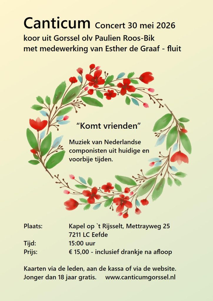 Het eerstvolgende concert, “Komt vrienden” is op 30 mei 2026 om 15:00 uur in de Kapel op `t Rijsselt.